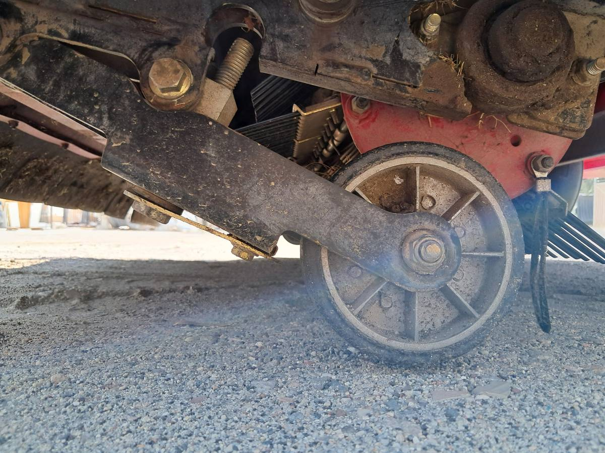 Sweeping continuous brush with polypropylene bristles, floating action provided by spring counterbalance and gauge wheel height adjustment.